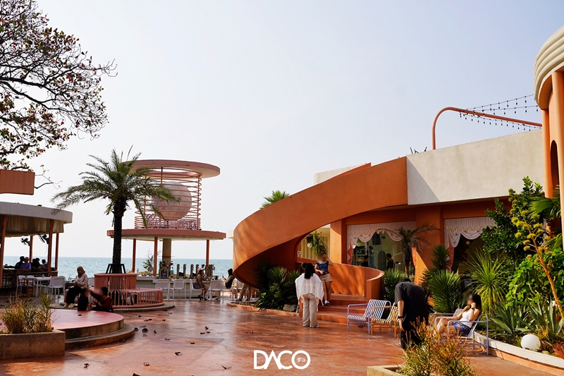 ตัวร้านตกแต่งในสไตล์ Modern Mid-Century ใช้โทนสีส้มอิฐ ชมพูแซลมอน ที่ตัดกับสีฟ้าสดใสของท้องฟ้าและทะเล ทำให้บรรยากาศดูร่วมสมัย แต่ยังมีกลิ่นอายเรโทรเบา ๆ