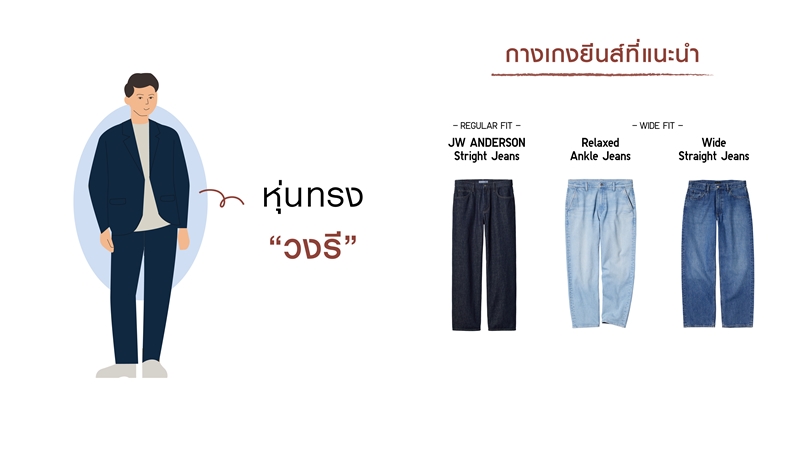 ผู้ชายหุ่นวงรี คือ รูปร่างที่มีหน้าท้องชัด ไหล่แคบดูกลมบริเวณลำตัวช่วงบน สำหรับผู้ชายหุ่นวงรี (Oval Shape) ซึ่งมีลักษณะรูปร่างที่ช่วงลำตัวดูกลม มีหน้าท้อง และไหล่แคบ เคล็ดลับการแต่งตัวคือ การพรางหน้าท้องและสร้างเส้นแนวตั้งให้รูปร่างดูเพรียวขึ้น โดยเฉพาะการเลือก “กางเกงยีนส์” ที่ช่วยเสริมลุคให้ดูสมดุลและมั่นใจมากขึ้น