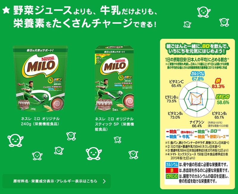 แต่ถ้าคุณชงไมโลดื่มสักหนึ่งแก้ว ตามสูตรการชงปกติของคนญี่ปุ่นคือ ไมโล 15 กรัม กับนม 150 มิลลิลิตร (คนญี่ปุ่นนิยมชงไมโลกับนมสด) จะได้ปริมาณธาตุเหล็ก 3.2 มิลลิกรัม นั่นหมายความว่าถ้าดื่มไมโลวันละหนึ่งแก้ว คุณผู้หญิงก็จะได้ปริมาณธาตุเหล็กเพิ่มขึ้นจนครอบคลุมค่าเฉลี่ยพอดี